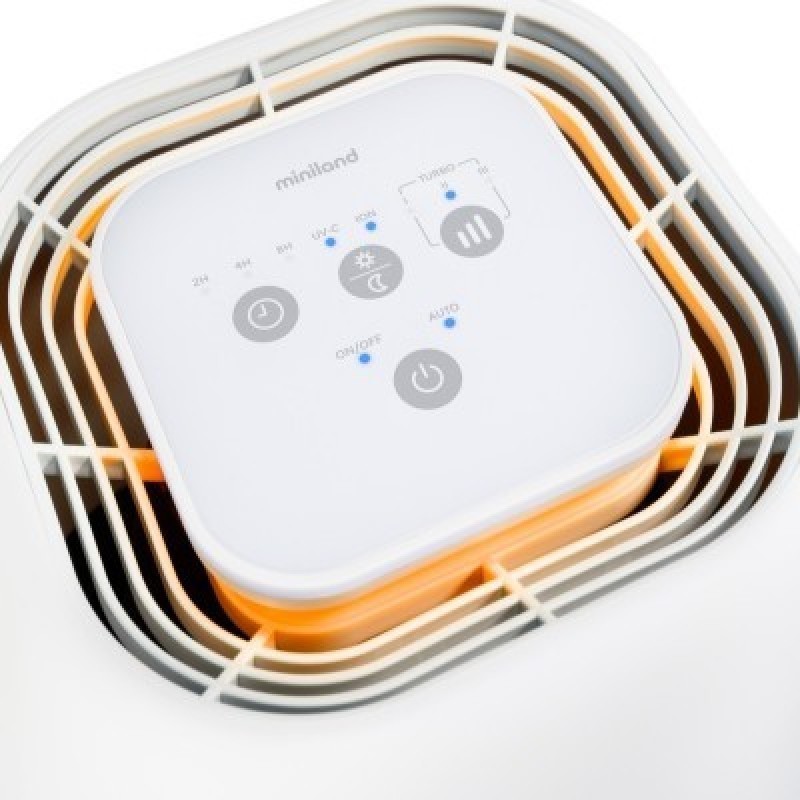 Miniland BabyPure 5 - самый современный очиститель воздуха с функцией ионизации для глубокой очистки. 5 уровней фильтрации: 1. Предварительный фильтр удаляет крупные частицы 2. HEPA фильтр удаляет мельчайшие частицы размером до 0,3 мкм (например, аллергены, пыльца, пыль или споры) 3. Фильтр с активированным углем поглощает нежелательные запахи в комнате. 4. Уровень очистки осуществляется с использованием ультрафиолетовых лучей, которые устраняют 99% бактерий, вирусов и микробов. 5. Еще более глубокий уровень с функцией ионизации для улавливания загрязняющих частиц с помощью отрицательных ионов. Помимо этого, умный гаджет имеет ряд отличительных особенностей и функций. 2 варианта ночного режима: без подсветки и как ночник (светильник с мягкой голубой подсветкой). Подходит для маленьких комнат в квартирах, загородных домах, офисах, площадью до 15 кв. метров. Цветовой индикатор качества воздуха. Таймер отключения. Сенсорная панель управления. 4 скорости потока (включая турбо-режим). Портативный. Красивый лаконичный дизайн впишется в интерьер любой, в том числе и детской комнаты. Бесшумный. Прост и безопасен в эксплуатации. Оснащен фильтром 3-в-1 для удаления пыли и неприятных запахов из воздуха