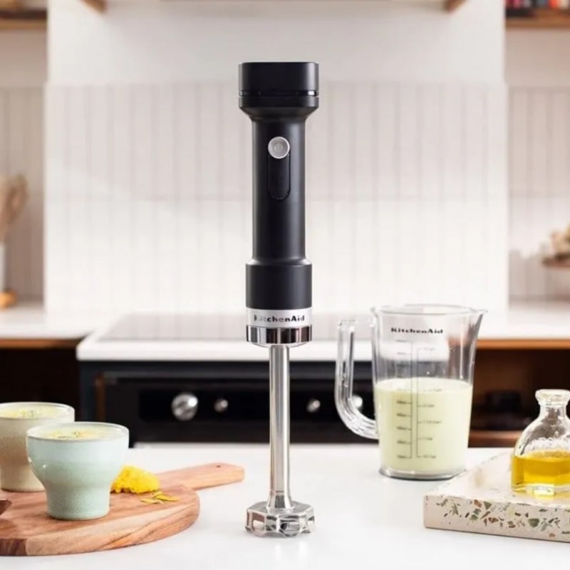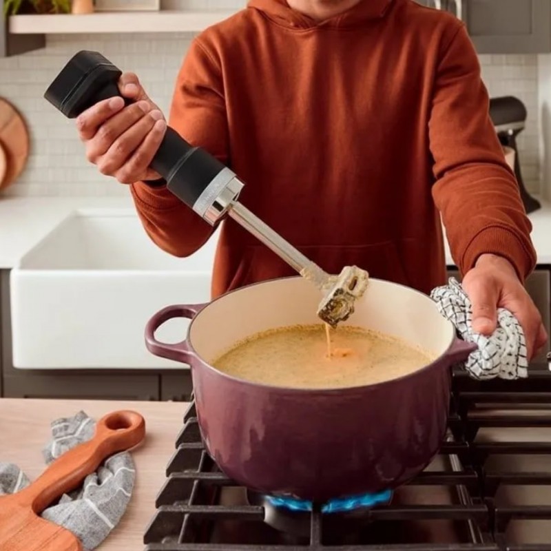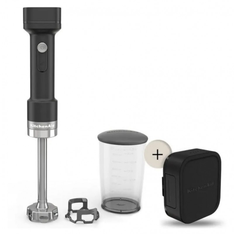 Беспроводной ручной блендер; съёмный аккумулятор 12 В; кабель USB-C; настенный адаптер; банка для смешивания на 3 чашки с крышкой; съёмная ножка блендера с лезвием из нержавеющей стали; запатентованная съёмная защита для посуды.