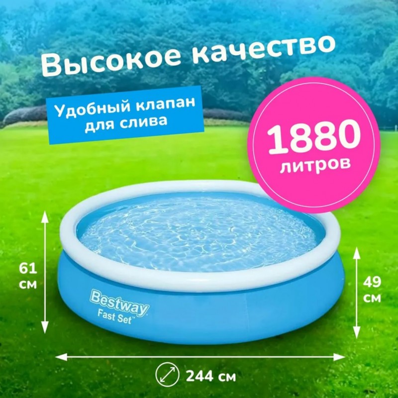Бассейн Bestway Fast Set - это идеальное решение для летнего отдыха на даче или во дворе дома. Бассейн надувной имеет диаметр 244 см и высоту 61 см, удобное пространство позволяет свободно купаться и играть. Надувной бассейн имеет вместительность 1880 литров, что является отличным выбором для всей семьи, так как бассейн и детский, и взрослый. Дети будут в восторге от возможности плескаться в своем собственном бассейне, а взрослые смогут насладиться прохладой в жаркий день.