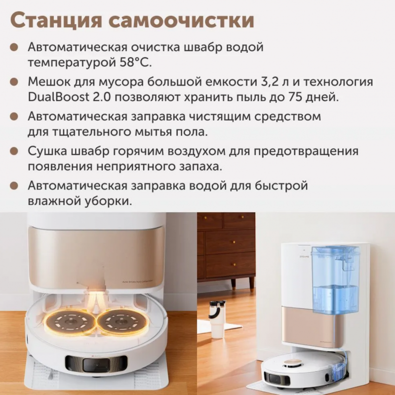 Сушка горячим воздухом — это новая тенденция в обслуживании роботов. После завершения работы швабры для влажной уборки будут высушены, что предотвратит появление неприятного запаха и повысит эффективность обслуживания пылесоса